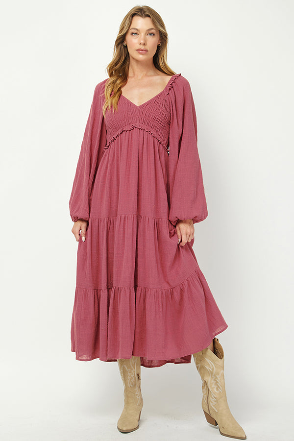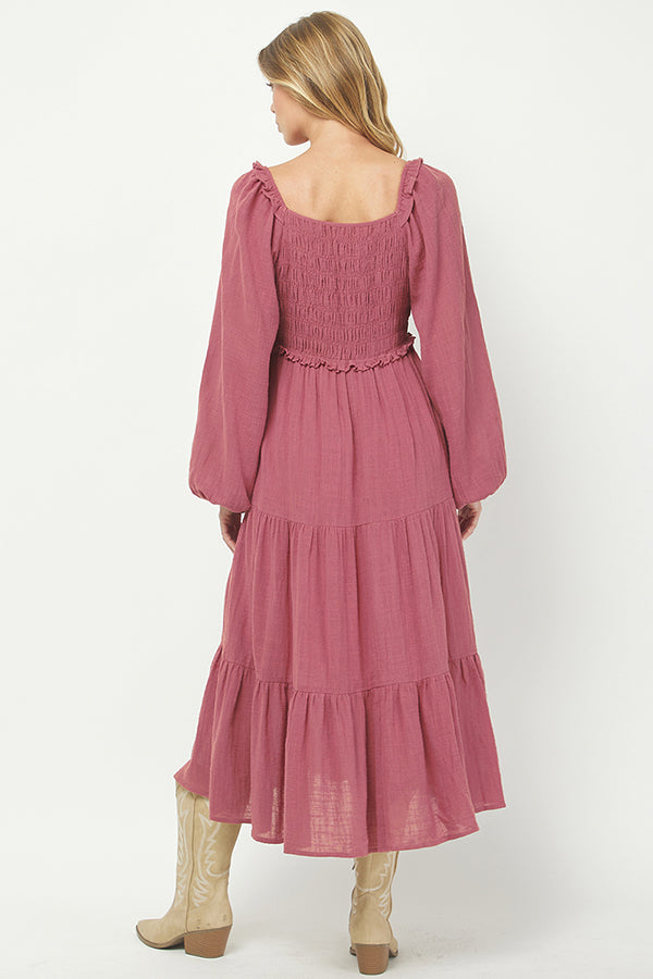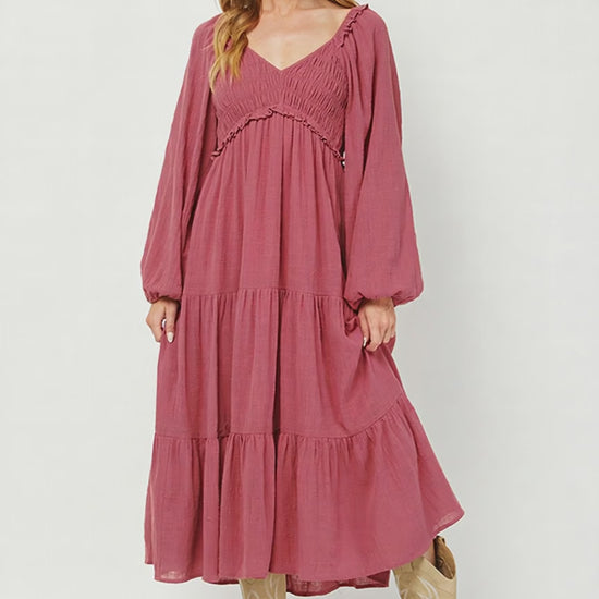 The Boho Rose Smocked Tiered Midi Dress brings effortless elegance with a laid-back, boho-inspired design. Crafted from soft, lightweight fabric in a rich rose hue, this dress features a flattering square neckline with delicate ruffle detailing, creating a soft, feminine silhouette. The smocked bodice provides both comfort and shape, allowing for a flexible and flattering fit, while the tiered skirt adds volume and flow for a relaxed yet refined look.