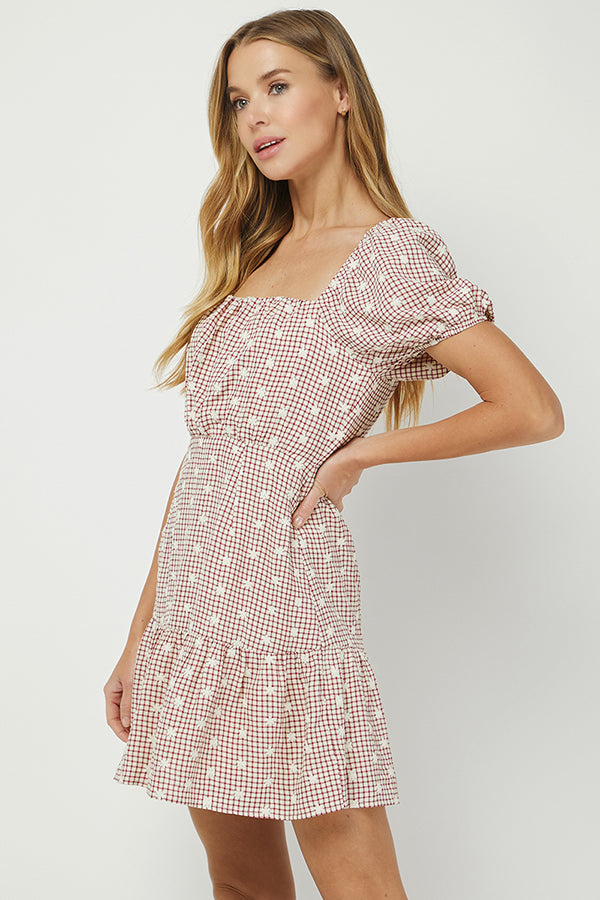 Sweet, sunny, and perfectly playful — this dress is your new go-to for easy charm with a nostalgic twist. Featuring a soft, gingham-inspired checkered print in warm, muted tones, it’s adorned with tiny embroidered white daisies that add a cheerful, vintage flair. The square neckline and short puff sleeves create a sweet, cottage core-inspired silhouette that’s flattering and feminine.