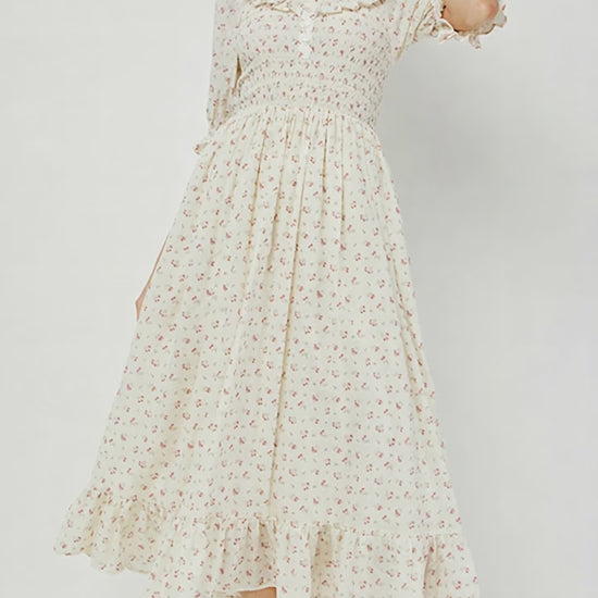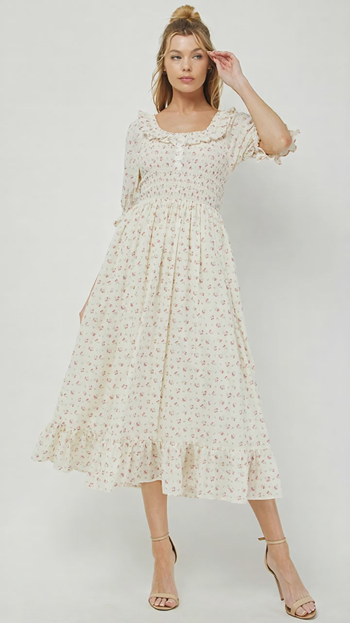 This dress offers a perfect balance of femininity and charm with its timeless floral print and delicate details. Featuring a soft, cream-colored fabric adorned with small, romantic floral patterns, the dress is designed with a smocked bodice that provides both comfort and a flattering, figure-hugging fit. The square neckline, accented with a ruffled trim, adds an elegant touch, while the puffed sleeves with ruffled edges give the dress a vintage-inspired look.