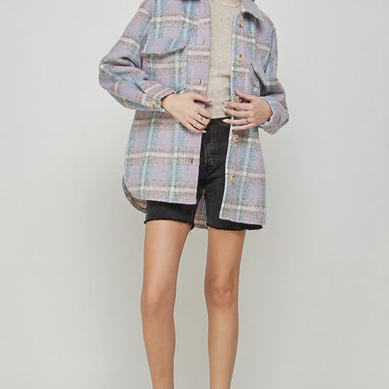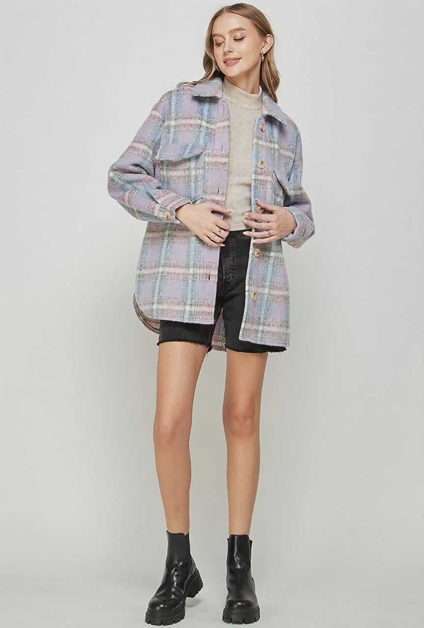 Elevate your outerwear collection with this cozy-chic pastel plaid shacket-an irresistible blend of warmth, comfort, and effortless style. Featuring a soft brushed fabric with a dreamy mix of lavender, blue, cream, and grey tones, this piece brings a fresh, feminine twist to classic plaid.